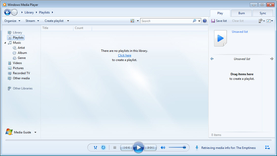 เริ่มจากเปิดโปรแกรม Windows Media Player 12 ขึ้นมาก็จะได้หน้าตาประมาณนี้