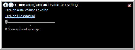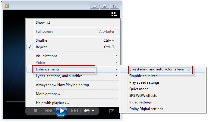 ถ้าโปรแกรมยังเป็นแบบหน้าจอใหญ่อยู่ให้ทำเป็นหน้าจอเล็กโดยการกดปุ่มลัด CTRL + 3 เมื่อเป็นหน้าจอเล็กแล้วให้คลิกขวาแถวๆ ตรงกลางโปรแกรมแล้วเลือก Enhancements > Crossfading and Auto Volume Leveling